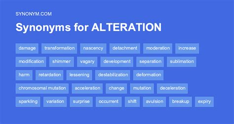 Another Word For Alteration. Web synonyms for alteration (other words and phrases for alteration). On this page you'll find 86 synonyms, antonyms, and words related to alteration, such as: