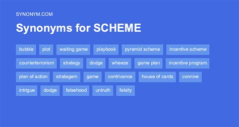 Web we hope that the following list of synonyms for the word scheme will help you to finish your crossword today. Synonyms for scheme (other words and phrases for scheme). Web find 4,842 synonyms for scheme and other similar words that you can use instead based on 23 separate contexts from our thesaurus. Web another way to say scheme? We've arranged the synonyms in length order so that they are easier to find. Arrangement, blueprint, design, device, game plan, and pattern. Ruses, devices, tricks, stratagems, artifices, gambits, ploys, shenanigans, wiles, sleights of hand On this page you'll find 196 synonyms, antonyms, and words related to scheme, such as: Scheme 3 letter words art fix map rig way scheme 4 letter words brew mood plan wile scheme 5 letter words scheme 6 letter words scheme 7 letter words Schema, design, layout, outline, plan, project, strategy, blueprint, game plan, aim, angle, arrangement, cabal, cadre, idea, collude, concoct, concoction, conspiracy, conspire, contrivance.
